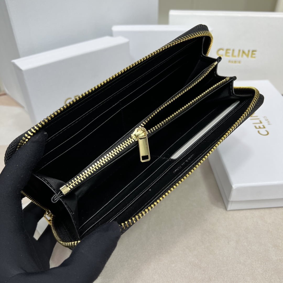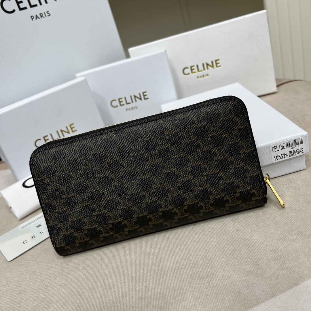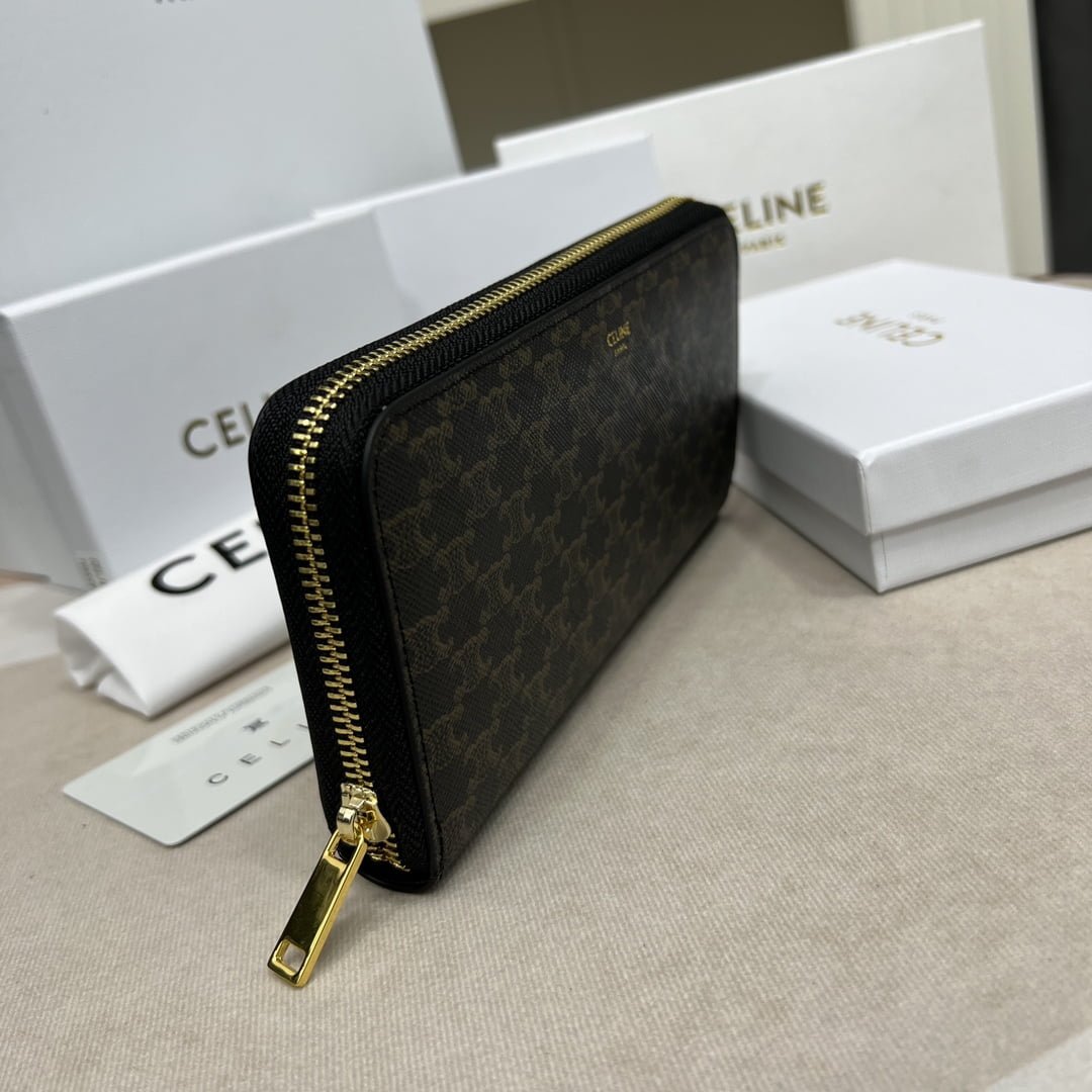 CELINE🇫🇷TRIOMPHE canvas large CCHARM zipper silver Bag Noir calfskin lined gold metal trim zipper switch with two folding inner compartments with eight credit card insert pockets with one zipper pocket with two flat pockets 📷 Dimensions: 7 X 4 inches (19 X 10 cm) Number: 10552
