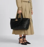Unveiled at the Spring-Summer 2023 fashion show. the Dior Toujours bag is distinguished by a casual and practical design. Crafted in black calfskin with Macrocannage topstitching. it showcases a spacious interior compartment with a matching pouch to organize essentials. Its leather strap closure keeps items secure while the D of the CD Lock closure twists to adjust the sides and enhance the bag’s silhouette. The leather handles can be adjusted using the small notches in order to be able to carry the large bag by hand or wear it over the shoulder.