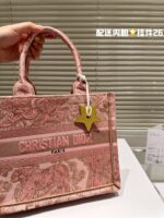 Dior Book Tote is an original work signed by Christian Dior Artistic Director Maria Grazia Chiuri and has become a classic of the brand. Designed to accommodate all your daily necessities. this small model is fully embroidered in a rose Dior Oblique pattern and emblazoned with the CHRISTIAN DIOR logo on the front. This handbag is Dior only