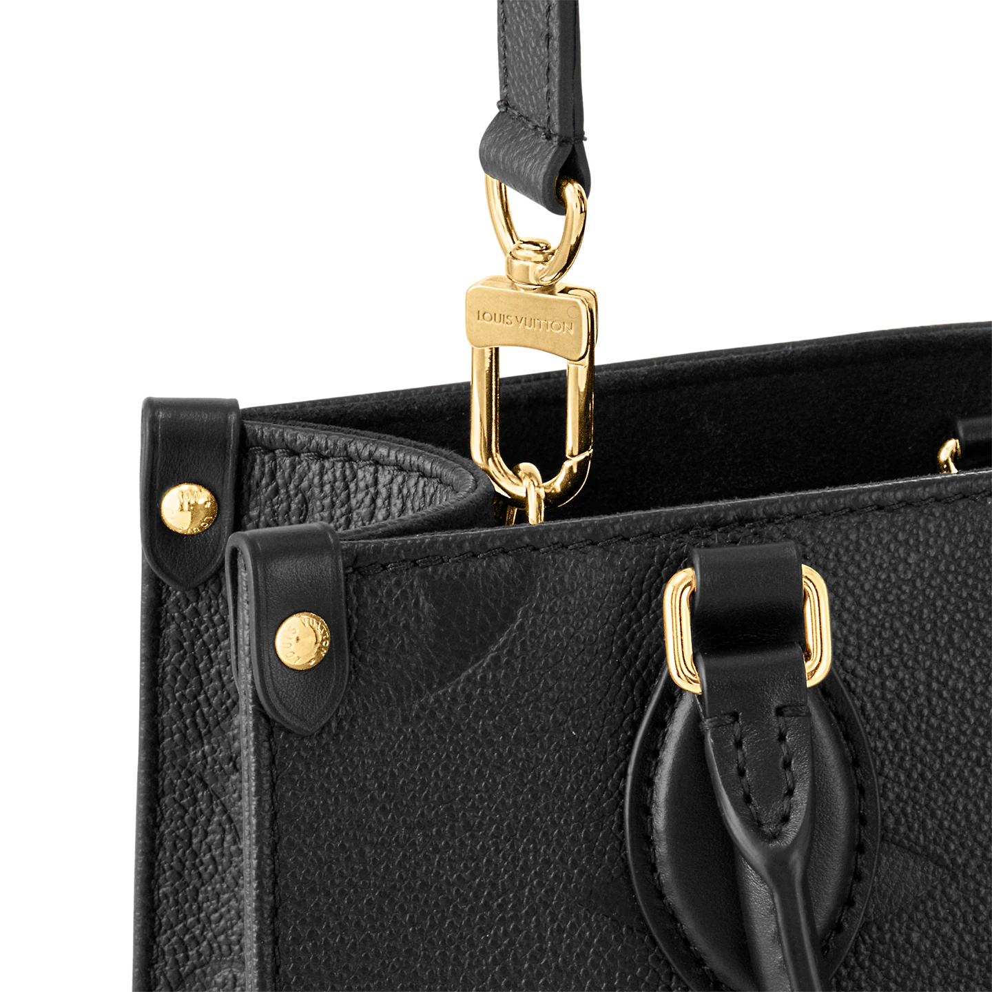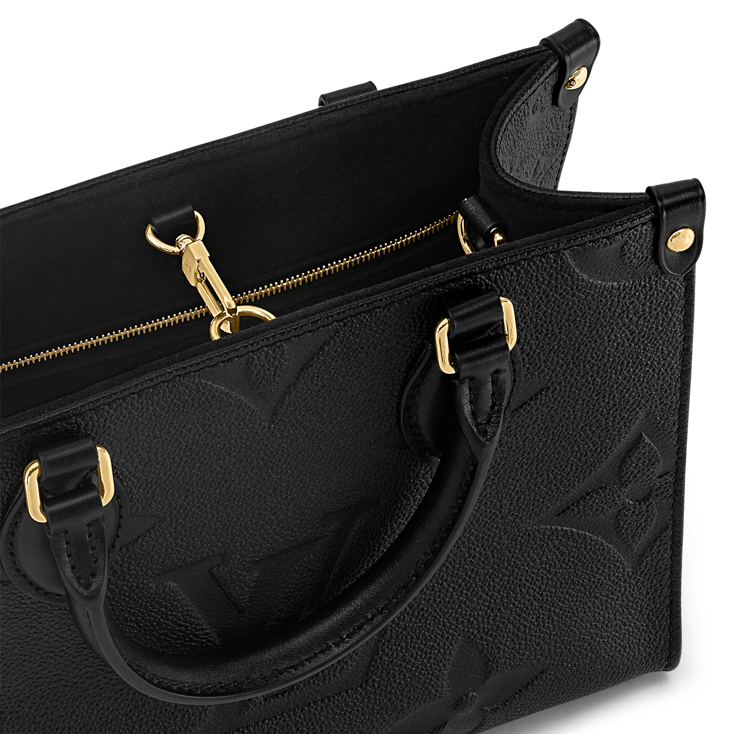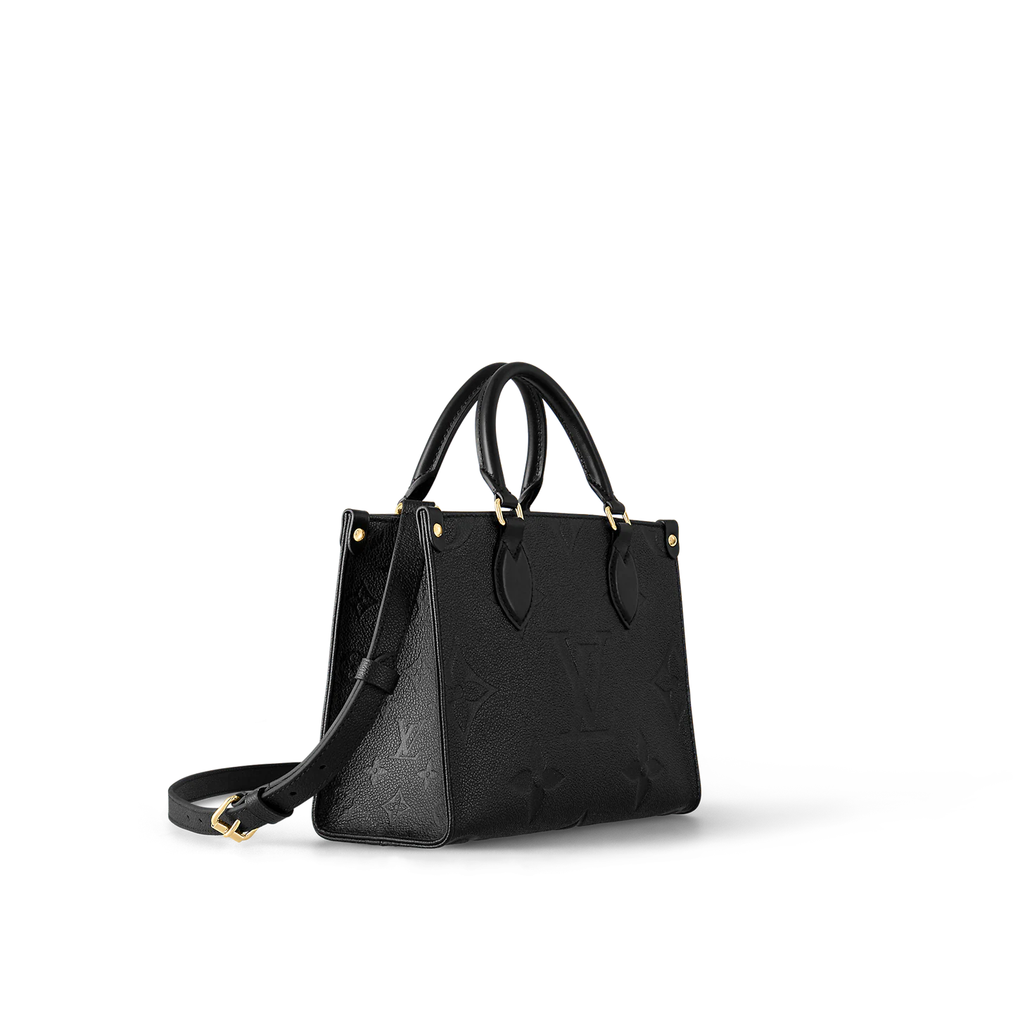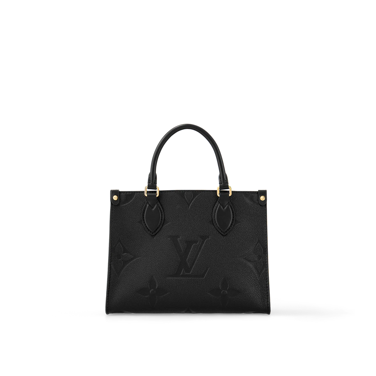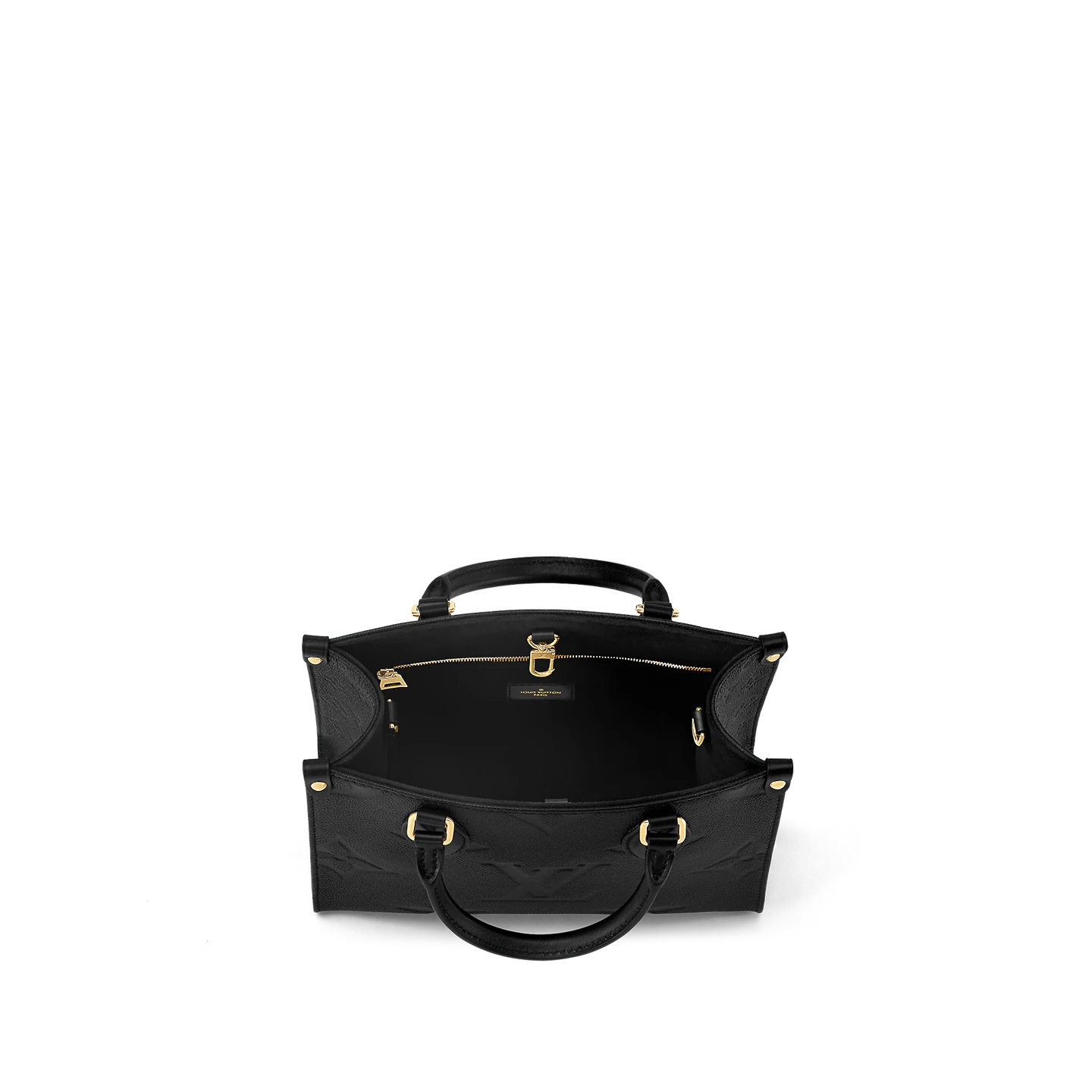Inspired by Louis Vuitton’s famous Sac Plat from 1968. the Onthego PM tote is fashioned in Monogram Empreinte leather. embossed with a subtle embossed Giant Monogram pattern. This smaller version of the original Onthego fits essentials such as an iPad Mini. Articulated top handles and an adjustable removable strap offer a variety of carry options.