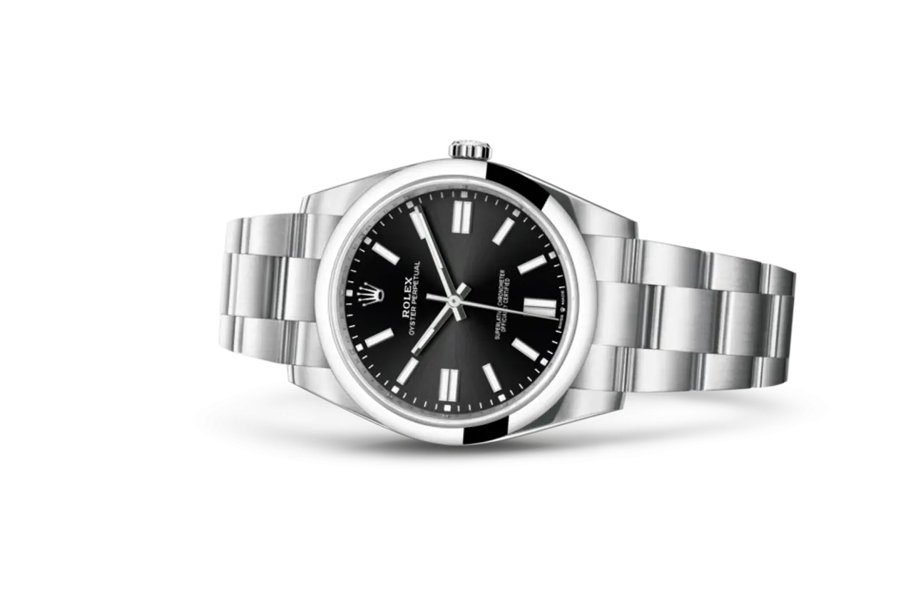 REFERENCE 124300 MODEL CASE Oyster, 41 mm, Oystersteel BEZEL Domed WATER-RESISTANCE Waterproof to 100 metres / 330 feet MOVEMENT Perpetual,